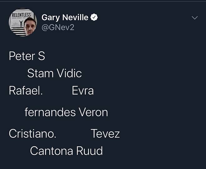 네빌은 지난 23일(한국 시간) 자신의 소셜미디어(SNS)에 맨체스터 유나이티드의 역대 외국인 선수 베스트11을 꼽아 게시했다.