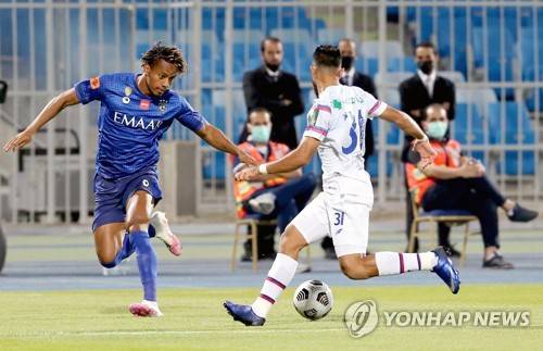 epa08778272 Al-Hilal's player Andre Carrillo (L) in action against Abha's Sari Amro (R) during the Semi-finals of the King's Cup match between Al-Hilal and Abha at Prince Faisal Bin Fahd Stadium, Riyadh, Saudi Arabia, 27 October 2020. EPA/STR