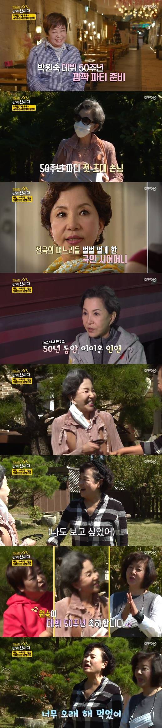 그 순간 서권순이 깜짝 손님으로 등장했다. 서권순은 "제가 공채 1기, 원숙이가 2기로 탤런트 공채 선, 후배다. 좋은 동료다"라며 박원숙과의 인연을 공개했다. 이어 박원숙의 데뷔 50주년을 축하하며 노래를 불렀다. 이에 박원숙은 "오래 해 먹었다"라고 이야기하면서 즐거운 분위기를 이어갔다.