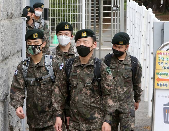 | ▲ 신종 코로나바이러스 감염증(코로나19) 확산 방지를 위해 통제됐던 장병 휴가가 정상 시행된 8일 오전 강원 춘천시 육군 2군단 사령부 위병소에서 병사들이 휴가를 떠나고 있다. 2020.5.8 |