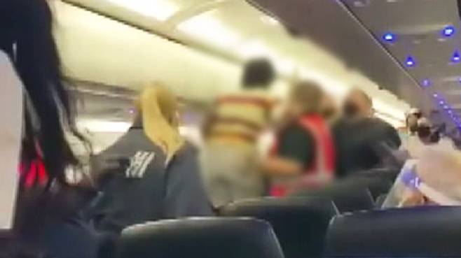 몇몇 승객이 여객기 복도까지 나와서 주먹을 휘두르며 몸싸움을 벌입니다.