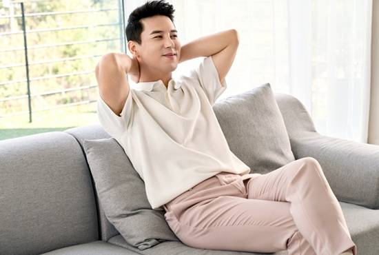 차분한 베이지계열 캐주얼룩을 입은 가수 장민호가 단백질 음료 한 잔과 함께 부드럽고 차분한 가을 남자 화보룩을 완성했다.