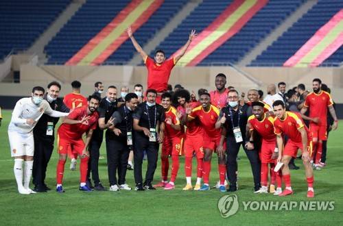 epa08784464 Al-Qadisiyah's players and staff celebrate after winning the Saudi Professional League soccer match between Al-Qadisiyah and Al-Taawoun at Prince Saud Bin Jalawy Stadium, in Dammam, Saudi Arabia, 29 October 2020. EPA/STR