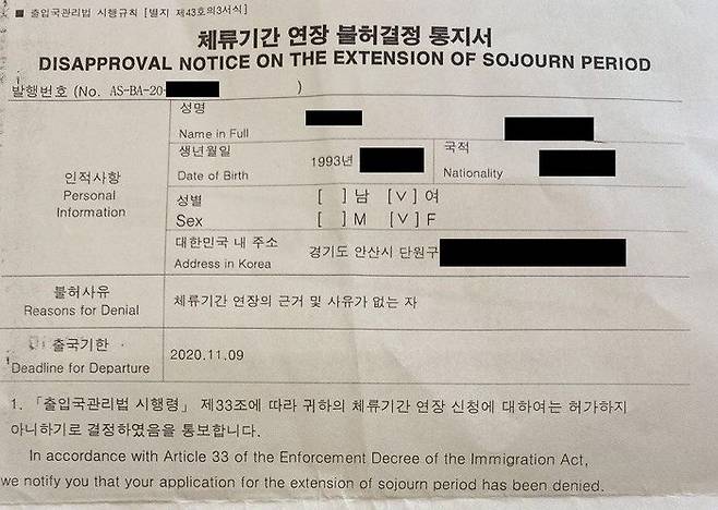 그런데 지난 26일(월) 대한민국 정부(법무부)는 해당 외국인노동자의 체류 자격(비자) 연장을 불허했다. '형사사건에서 피해자는 제3자에 불과하다, 변호사가 대리해서 진행하니 꼭 한국에 있을 필요가 없다'는 것이 체류 자격 연장 불허 이유다.