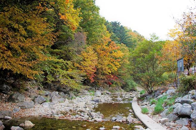 여름에 물놀이를 하는 아이들로 시끌벅적했을, 우리가 원래 알던 계곡의 분위기와는 또 다르다. 조용히 물소리만 들리는 계곡에 있으면, 마치 첩첩산중 속에 있는 듯하다. 최근에는 산책로도 계곡길을 따라 정비되어서 길을 따라 가을 풍경을 즐기기에 안성맞춤이다.