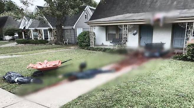 한 주택 앞 사람들이 쓰러져 있습니다.