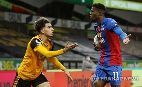 epa08787096 Rayan Ait-Nouri of Wolverhampton (L) argues against Wilfried Zaha of Crystal Palace (R) during the English Premier League match between Wolverhampton Wanderers and Crystal Palace in Wolverhampton, Britain 30 October 2020. EPA/Andrew Boyers / POOL EDITORIAL USE ONLY. No use with unauthorized audio, video, data, fixture lists, club/league logos or 'live' services. Online in-match use limited to 120 images, no video emulation. No use in betting, games or single club/league/player publications.