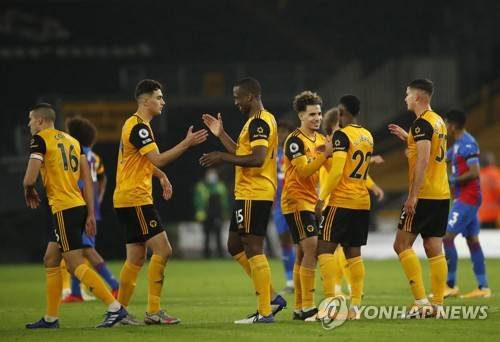 epa08787158 Wolverhampton players celebrate after wining their game at the end of the English Premier League match between Wolverhampton Wanderers and Crystal Palace in Wolverhampton, Britain 30 October 2020. EPA/Andrew Boyers / POOL EDITORIAL USE ONLY. No use with unauthorized audio, video, data, fixture lists, club/league logos or 'live' services. Online in-match use limited to 120 images, no video emulation. No use in betting, games or single club/league/player publications.