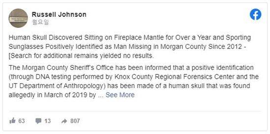 현지 시간으로 27일 미국 매체 피플 등 외신들은 테네시주 모건 카운티에서 2012년에 실종된 79살 윌리 맥켄 씨의 두개골이 발견됐다고 보도했습니다.
