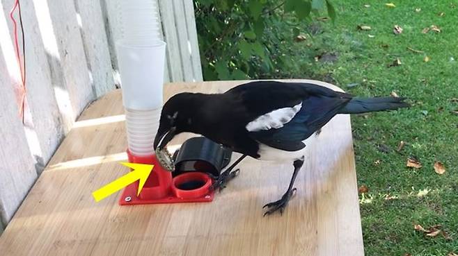 영상을 보면 까치 한 마리가 병뚜껑을 물고 기계가 설치된 작업대 위로 올라옵니다. 까치는 병뚜껑을 작업대에 뚫린 구멍 속으로 야무지게 집어넣는데요, 그러자 몇 초 뒤 기계에서 간식 한 알이 튜브를 타고 내려옵니다.