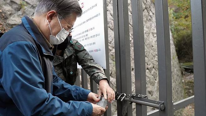 문 대통령은 북측면 제1출입구인 부암동 토끼굴에 도착해 김도균 수도방위사령관으로부터 북악산 관리 현황을 보고 받았고, 이후 관리병에게 열쇠를 건네받아 철문을 열었습니다.