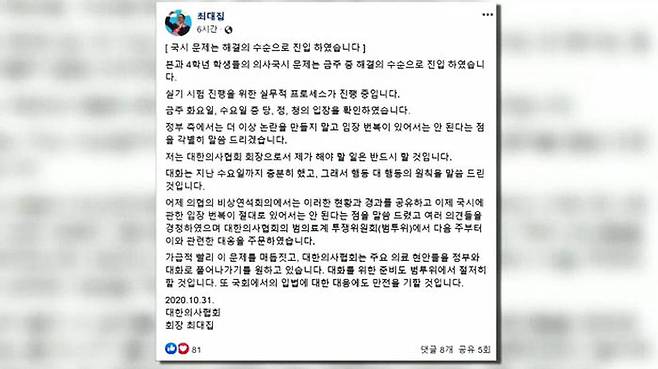 최대집 대한의사협회 회장은 오늘(31일) 오전 자신의 SNS에 '의사 국가고시 문제가 이번 주 해결 수순에 들어갔다. 실기 시험 진행을 위한 실무적 프로세스가 진행 중'이라고 썼습니다.