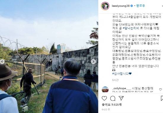 이시영은 31일 소셜미디어에 "52년 만에 시민의 품으로 돌아오는 북악산 둘레길. 이렇게 뜻깊은 순간에 초대해주셔서 너무 영광이었습니다"라는 글과 함께 여러 장의 사진을 올렸다.
