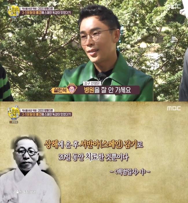 설민석은 "김구 선생님은 병원을 안 간다. 김구 선생님이 일생에 딱 두 번 병원에 갔는데, 한 번은 혹을 떼러 갔고, 그다음에 감기 때문에 병원을 갔다. 그게 바로 스페인 독감이었다"고 말했다.