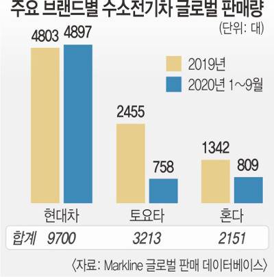넥쏘는 지난 1~9월 글로벌 시장에서도 4897대가 판매돼 지난해 판매대수(4803대)를 일찌감치 넘어섰다. 토요타 미라이, 혼다 클래리티 등 경쟁 모델의 판매 상황이 지난해보다 위축된 것과는 상반된 모습이다. 같은 기간 코로나19로 미국과 유럽, 일본 등 주요국의 수소차 판매량이 전체적으로 감소한 점을 감안해도 넥쏘의 판매 오름세는 돋보인다.