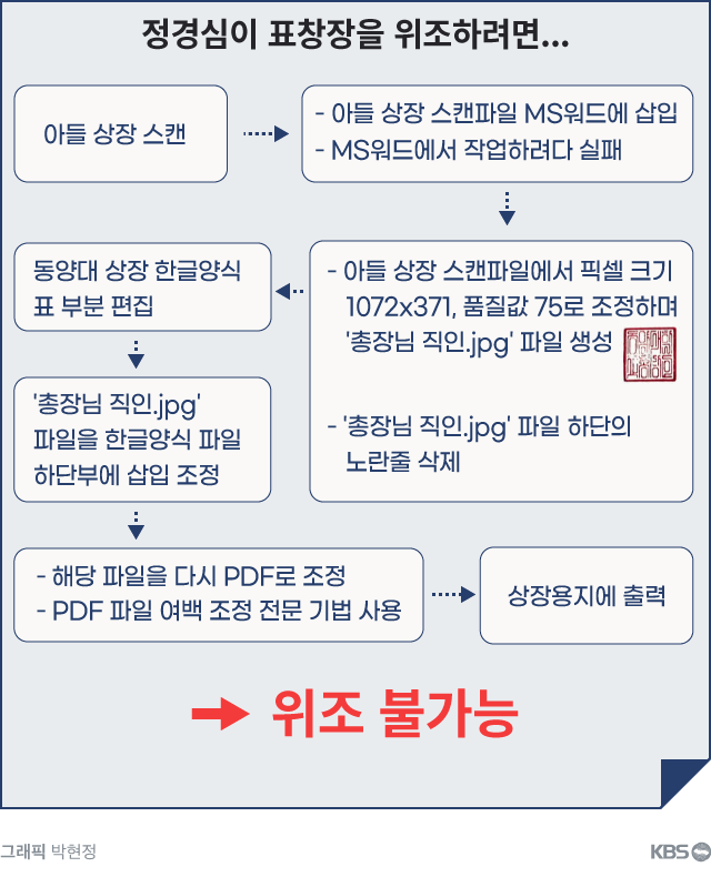 결국 정 교수 PC에서 발견된 상장 서식 '한글 파일'을 수정해서 인쇄해도, 표창장 완성본이 담긴 'PDF 파일'을 그대로 뽑아도 검찰이 주장한 것처럼 표창장을 위조하는 건 불가능하다는 게 변호인의 주장입니다. 완벽한 표창장을 위해선 정 교수가 무려 '10단계'를 거쳐야 한다며 이를 하나하나 열거하기도 했습니다.