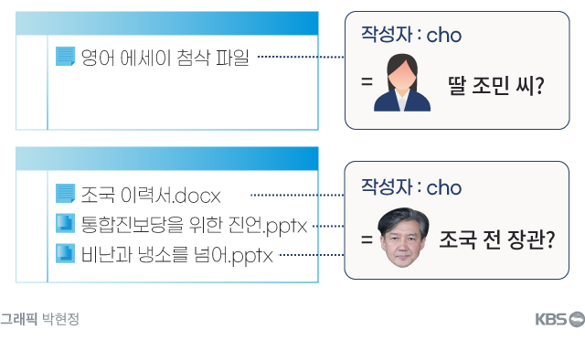 이때 논쟁거리가 된 것 중 하나가, 바로 작성자 'CHO'입니다. 정 교수 측은 동양대 인문학 영재프로그램 참가 학생들의 영어 에세이 첨삭 파일의 속성을 보면 작성자가 'CHO'(조)로 돼있는 점을 들어, 딸 조민 씨가 튜터로서 자신의 노트북을 이용해 직접 첨삭을 한 것이라고 주장했습니다. 동양대 표창장의 근거가 되는 활동이란 거죠.
