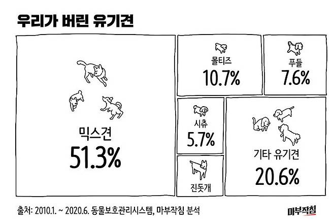 유기견 중 가장 많은 건 믹스견, 즉 잡종이었다. 34만 6,762마리로 전체 유기견의 51.3%, 절반이 넘었다. 다음으로 많은 건 몰티즈 7만 2,333마리(10.7%)였고 푸들 5만 1,475마리(7.6%), 시츄 3만 8,472마리(5.7%) 순이었다. 유기묘 중에선 '알 수 없음'이 19만 595마리(73.5%)로 최다였고 한국고양이(코리안숏헤어)가 6만 3,932마리(24.7%)로 다음이었다. 그 외엔 페르시안 0.6%, 터키시 앙골라 0.3% 등으로 나머지는 1% 미만으로 나타났다.