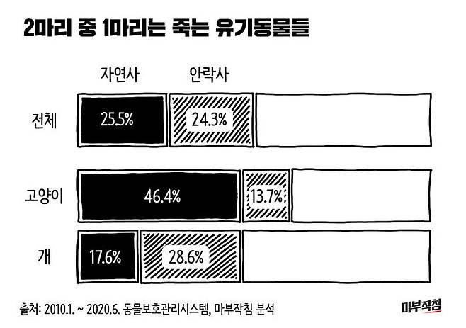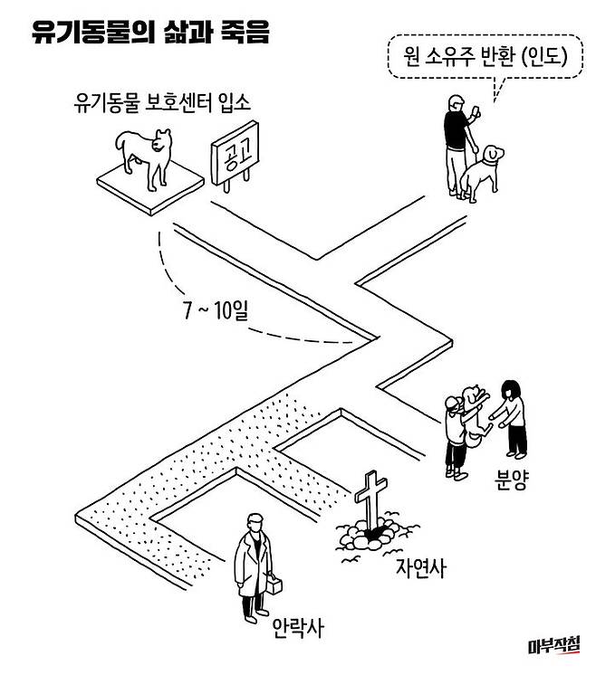 그렇게 지자체 소유가 된 유기동물의 다음은, 삶 또는 죽음이다. 새 주인을 만나거나 원래 주인에게 돌아가는 '입양'과 '반환', 혹은 안락사하거나 또는 자연사하거나. [마부작침 ] 분석 결과, 지난 10년 동안 죽음으로 귀결된 유기동물은 47만 1,453마리, 전체의 49.8%였다. 보호센터에 들어간 유기동물 중 절반은 죽고 절반만 살아남았던 것이다. 새 주인을 만난 입양은 30.6%, 원 주인에게 돌아간 반환이 12.3%였고 보호 중인 건 2.9%에 불과했다. 2019년만 놓고 보면 사망률은 더 높았다. 사망 52.3%, 입양 29.5%, 반환 12.3%였고 보호 중은 3.4%였다.