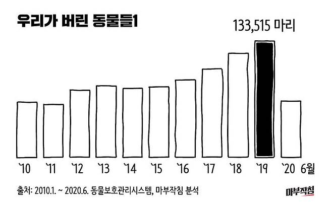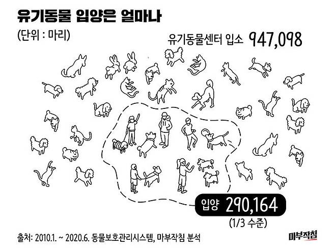많이 키우는 만큼 많이 버리는 걸까. [마부작침]은 농림부가 운영하는 '동물보호관리시스템'에 등록된 유실·유기동물 자료 10년 치를 확보해 분석했다. 등록 기준 2010년 1월 1일부터 2020년 6월 30일까지 자료다. 동물보호법에 따라 유실·유기동물을 보호하고 있으면 원래 소유자 등이 이런 사실을 알 수 있도록 7일 동안 공고해야 한다. 또 공고 뒤 10일이 지나도 소유자 등을 알 수 없으면 해당 지방자치단체장이 그 동물의 소유권을 갖게 된다. 지난 10년 간 우리가 버린 것으로 공식 등록된 동물은 94만 7,098마리였다.