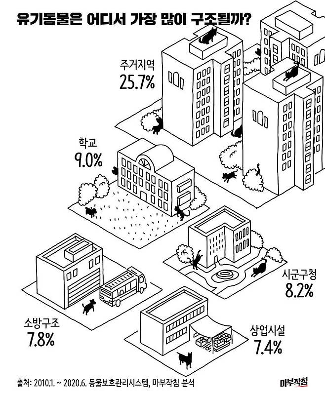 유기동물은 어디에 가장 많이 버려질까? 이 질문은 답하기 어렵지만 어디서 많이 발견되는지는 알 수 있다. 장소 정보가 등록된 유기동물 42만 마리의 키워드 분석을 통해 발견 장소를 정리했다. 네 마리 중 한 마리 꼴, 총 10만 8,212마리는 아파트, 즉 주거지역 근처에서 발견됐다. 다음은 학교(9.0%), 시군구청(8.2%), 상업시설(7.4%) 순이었다. 소방대원들에게 구조된 경우도 7.8%로 높은 편이었다. 동물은 움직이고 이동하기에 이 발견 장소와 유기 지역이 꼭 일치하진 않는다. 원래 집을 찾아오지 못하도록 먼 곳에 버렸을 가능성도 있다.