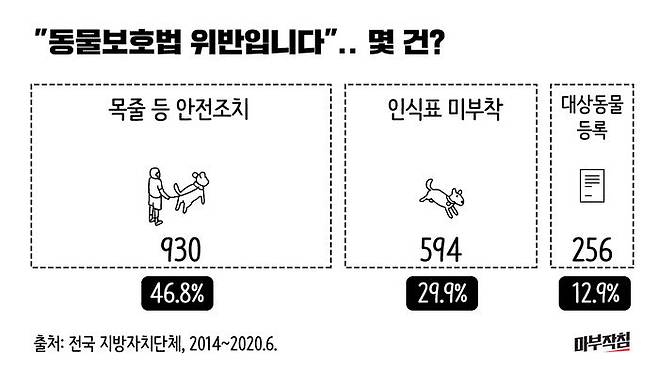 가장 많았던 건 동물보호법 13조 2항의 '목줄 등 안전조치' 위반이었다. 모두 930건, 46.8%였다. 다음은 13조 1항 '인식표 부착' 위반 594건(29.9%), 12조 1항 '등록대상동물 등록' 위반 256건(12.9%) 순이었다. '맹견의 관리'에 관한 조항인 13조의 2 위반은 10여 건에 불과했다.