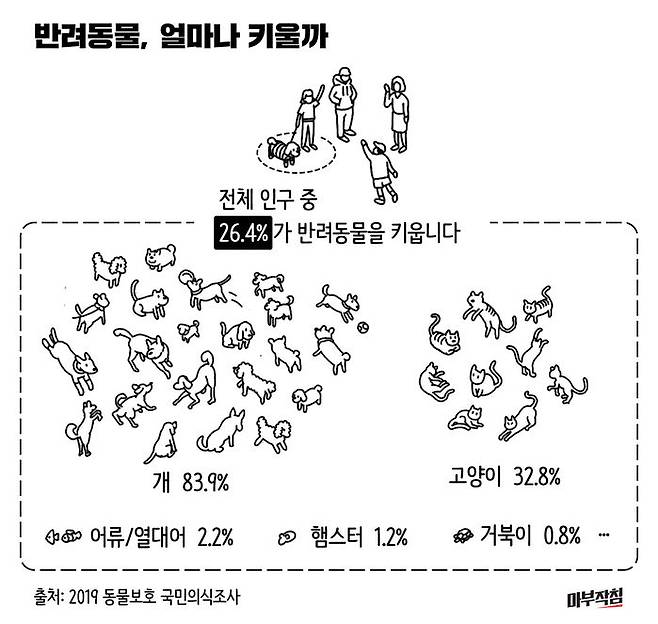 불과 10년 전만 해도 이 수치는 17.4%였다. 그러다 2019년 조사에선 9% 포인트가 늘어났다. 농림축산식품부의 '동물보호에 대한 국민의식 조사' 결과에 따르면 반려동물을 키우고 있다고 응답한 이들이 전체의 26.4%에 이르렀다. 이를 토대로 추산하면 반려동물 가구 수는 약 591만에 이른다. 2017년 28.1%보다 소폭 감소하긴 했지만 관련 산업과 함께 반려동물과 양육 가구는 늘어나고 있는 것으로 보인다.