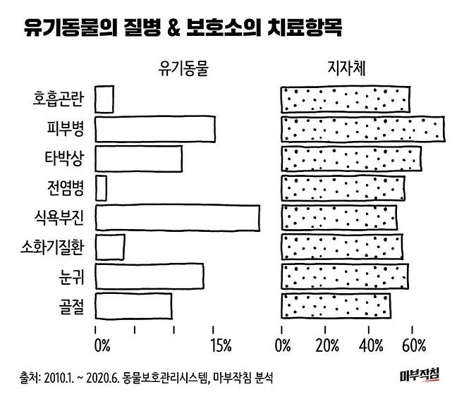 질병 치료는 어떨까. [마부작침]은 전국 지자체의 동물보호센터에 유기동물 치료 항목과 응급 치료 여부를 정보공개청구를 통해 확보했다. 전체 보호센터의 75.5%에서 치료 가능했던 질병은 피부병이었다. 가장 비율이 높았다. 반면 식욕 부진은 단 53.6%에서만 조치가 이뤄지고 있었다. 질병 평균은 59.5%만 치료 받았다. 질병 있는 유기동물의 자연사 비율이 높은 원인 중 하나일 것으로 보인다.