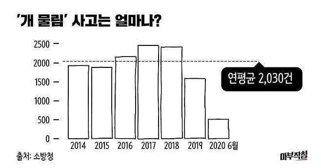 '개 물림 사고'는 매년 적잖게 발생한다. [마부작침]이 정보공개청구를 통해 입수한 소방청의 '개 물림 사고로 인한 환자 이송 현황' 자료를 보면 2014년 1,889명이었던 이송 환자는 2016년부터 3년 연속 2천 명을 넘어섰다. 2019년엔 1,565명으로 다소 줄었다. 최근 6년 간 평균을 보면 매년 2천 명 넘게 개에 물려 병원을 찾았다. 올 들어 6월까지는 512명으로 집계됐다. 119 구급대를 통하지 않고 병원에 갔거나 사람 말고 다른 동물을 문 경우까지 합하면 개 물림 사고는 이보다 더 많을 것으로 보인다.