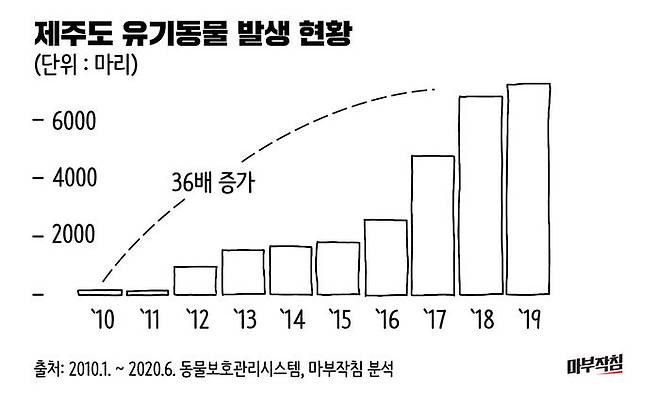 [마부작침]이 분석한 동물보호관리시스템 자료에 따르면 2010년 한해에 205마리였던 제주의 유기동물 수는 2019년 7,307마리에 이르렀다. 10년 사이에 무려 36배나 폭증한 것이다. 같은 기간 전체 유기동물 수는 2010년 6만 2,801마리에서 2019년 13만 3,515마리로 2배 정도 늘어난 것과 비교해도 압도적인 증가다. 제주 센터가 적정 수준으로 관리할 수 있는 동물 수는 300마리 정도다. 작년 한 해에만 감당할 수 있는 유기동물의 24배가 발생한 것이다. 결국 제주 센터는 현재 적정 관리 수의 1.7배인 500마리를 보호하고 있다. '5성급 호텔' 수준의 시설과 상대적으로 풍족한 예산이 있더라도 허덕일 수밖에 없는 상황이다.