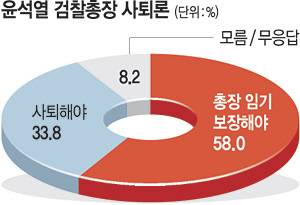 문화일보가 창간 29주년을 맞아 진행한 여론조사에서 윤석열 검찰총장의 임기를 보장해야 한다는 응답이 58.0%로, 사퇴해야 한다는 응답(33.8%)보다 높게 나왔다.