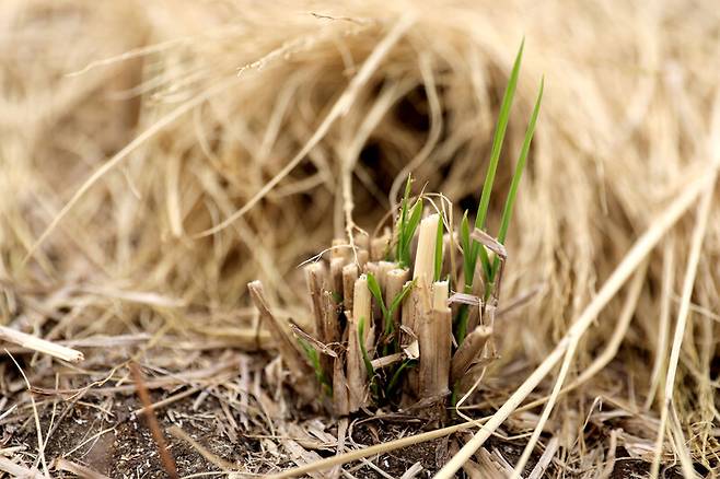 가을걷이를 하느라 벼 밑동까지 베어낸 자리에 새잎들이 올라오고 있습니다.