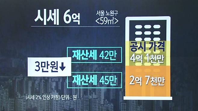 그런데 정부가 공시가격 6억 이하 1주택자는 재산세 감면 혜택을 주기로 했기 때문에 이 아파트 1주택자는 올해 45만 원 내던 재산세를 내년에는 42만 원만 내면 됩니다.