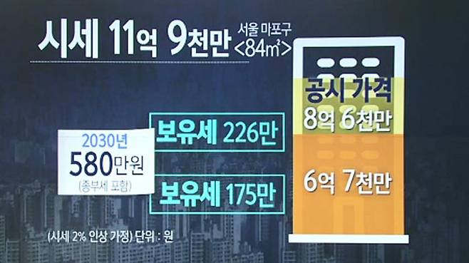 올해 공시가격 6억 7천만 원 서울 마포구 84㎡ 아파트는 내년 공시가격이 8억 6천만 원까지 오를 것으로 보이는데, 올해 175만 원이었던 보유세는 내년 226만 원으로 오르고 2030년이 되면 580만 원까지 세 부담이 크게 늘어납니다.