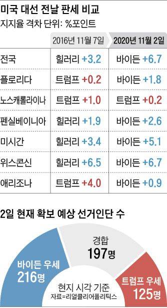 정치분석매체 리얼클리어폴리틱스가 선거 당일까지 집계한 각종 여론조사 평균에 따르면 조 바이든 민주당 후보가 도널드 트럼프 미 대통령을 플로리다·펜실베이니아·위스콘신·미시간·노스캐롤라이나·애리조나 등 6대 경합주에서 평균 2.3%포인트 앞서는 것으로 나타났다. 이는 이 매체가 통계를 작성하기 시작한 지난 5월이후 최소치다. 그만큼 선거막판 양측의 접전이 벌어지고 있다는 것이다.