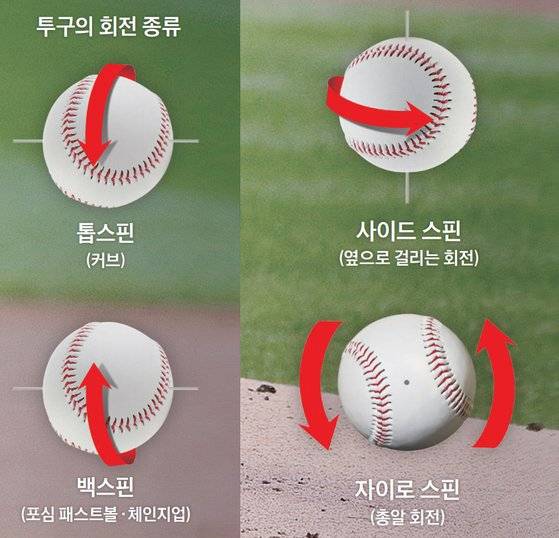 이 밖에 우리에게 생소한 자이로 스핀(gyro spin)이라는 것도 있다. 투구의 진행 방향과 회전축이 평행을 이루는 회전이라고 한다. 이는 총알이 날아가는 원리와 같다고 해서 라이플(rifle, 소총) 스핀이라고도 부른다.