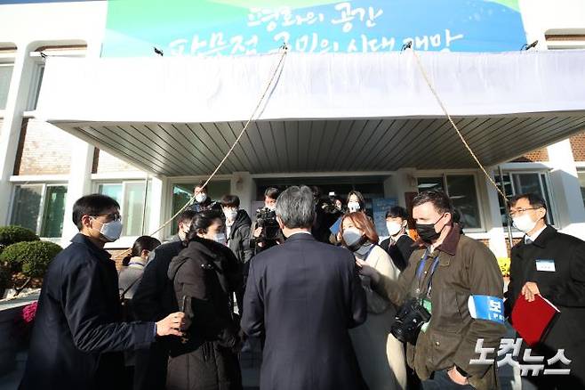 이인영 통일부 장관이 4일 오전 경기도 파주시 판문점견학지원센터에서 열린 개소식에 참석하기 위해 입장하기 전 취재진의 질문에 답하고 있다. (사진공동취재단)
