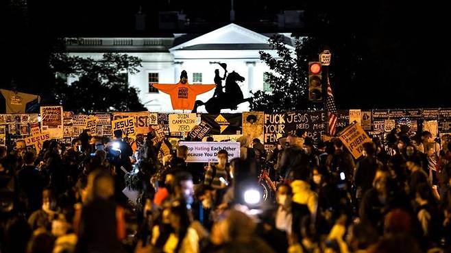 앞서 도널드 트럼프 대통령이 개표 결과가 나오기도 전에 승리 선언을 할 수도 있다는 보도가 나옴에 따라 워싱턴 DC 백악관 앞 라파예트 광장에는 조 바이든 민주당 후보 측 지지자들이 모여 항의 시위에 나섰습니다.