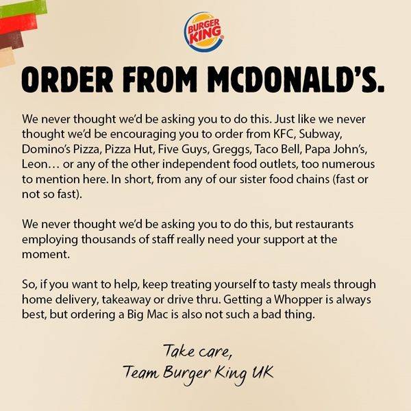 버거킹 측은 "우리도 이런 부탁을 하게 될 줄은 꿈에도 몰랐습니다"라면서, 맥도날드 외에도 KFC, 써브웨이, 도미노 피자, 피자헛 등 수많은 경쟁사를 나열하고 홍보했습니다. 버거킹 측은 "너무 많아 다 언급할 수는 없지만, 이와 같은 업체들에서 식사를 주문하시길 권해드립니다"라고 밝혀 글을 읽는 이들을 의아하게 했습니다.
