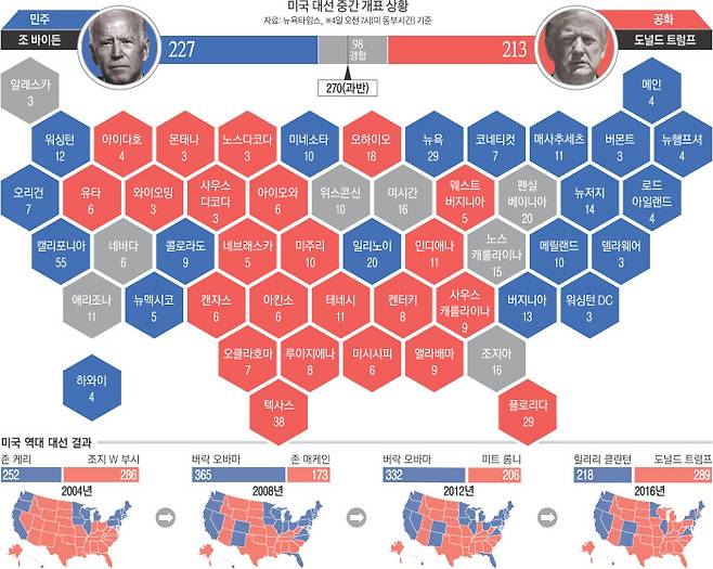 미국 대선에선 각 주에 배분된 538명의 선거인단 중 270명을 확보해야 승리한다. 4일 오전 8시(한국시간 4일 오후 10시)까지 주요 언론사 및 정치분석매체 집계에선 바이든 후보가 확보한 선거인단이 트럼프 대통령에 비해 다소 많았다. CNN은 바이든 후보와 트럼프 대통령이 확보한 선거인단을 224명 대 213명으로 집계했다. 폭스뉴스는 238명 대 213명, 뉴욕타임스는 227명 대 213명으로 판단했다. 정치분석매체 리얼클리어폴리틱스(RCP)는 225명 대 213명으로 집계했다. 선거인단 538명 가운데 16~18%에 달하는 90~100명이 아직 승부를 확정짓지 못한 ‘경합’ 상태다.