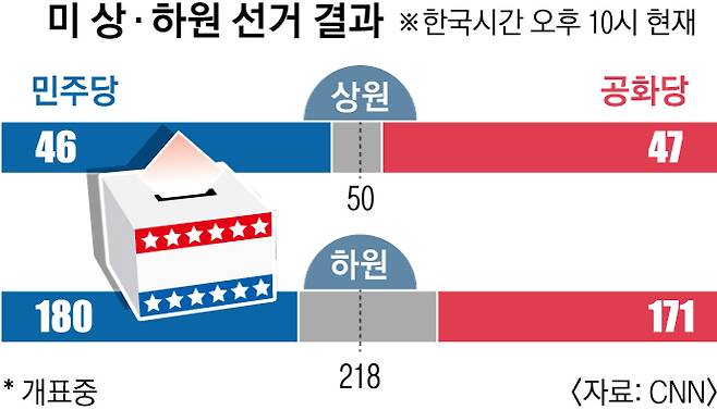 218석 이상의 과반을 차지하기 위한 이날 선거에서 CNN의 중간 집계 결과 공화당 171석, 민주당 180석으로 민주당이 우세한 것으로 나타났다.