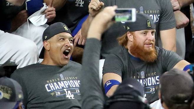특히 우승 기념 촬영 때, 림프종 암으로 1년간 투병했던 데이브 로버츠 다저스 감독 바로 옆에 앉아 논란을 키웠습니다.