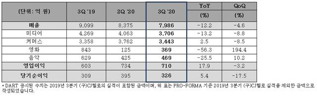 엔터테인먼트 & 라이프스타일 컴퍼니 CJ ENM은 한국채택국제회계 (K-IFRS) 연결기준 올해 3분기 매출 7986억원, 영업이익 710억원을 기록했다고 5일 밝혔다.