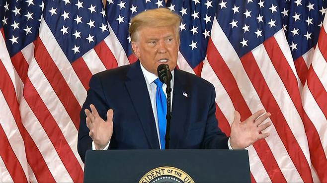 트럼프 대통령은 지난 3일 치러진 대선 결과 현재 기준 선거인단 214명을 확보해 264명을 확보한 조 바이든 민주당 후보에게 뒤처진 상황입니다.