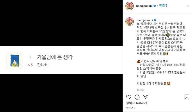 또 “이번 주 잔나비 일정표 11월 6일(금) 밤 12시 40분 KBS 유희열의 스케치북 출연, 11월 8일(일) 오후 6시 KBS 열린음악회 출연 사랑합니다 우리 팬분들”라며 앞으로 계획까지 밝혔다.