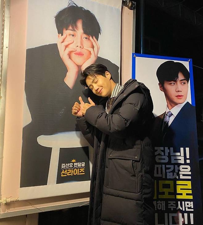 배우 김선호가 팬들이 보내준 간식 차 인증 사진을 공개했다.