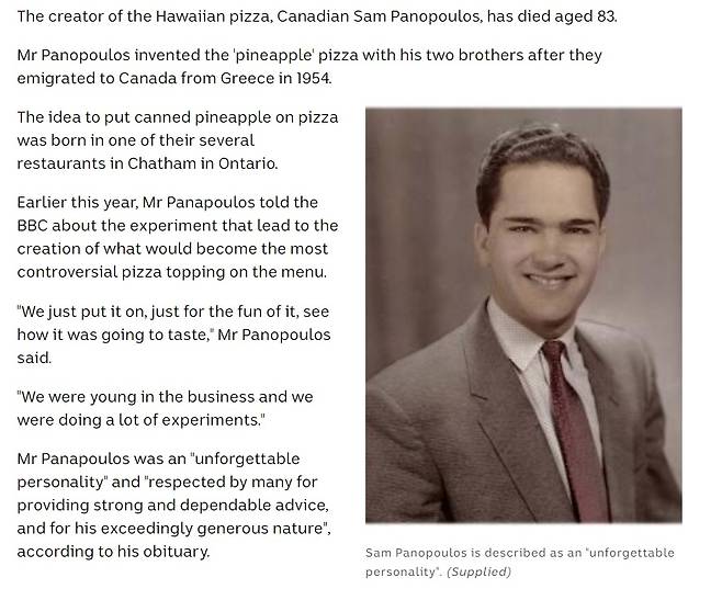 이처럼 논란(?)을 일으키곤 하는 하와이안 피자는 이름과 달리 하와이에서 만들어진 것도, 피자의 본고장인 이탈리아의 산물도 아니다. 앞서 잠깐 언급했듯이, 1962년 캐나다 온타리오주 차탐에서 새털라이트라는 레스토랑을 운영하던 '샘 파노포울로스(Sam Panopoulos)'에 의해 처음 탄생했다. 캐나다 연방총리가 이 피자에 대한 지지발언을 한 것도 이와 무관하지 않을 것이다.