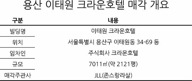 크라운호텔은 1980년에 본관과 별관이 지어졌고, 2000년도에 추가로 별관을 건립한 바 있다. 용산구의 녹사평대로에 접해 대지면적이 7,011㎡(약 2121평)인 개발 부지로 서울특별시 용산구 이태원동 34-69, 44-64, 34-154, 34-159, 36-34 등이 매각 대상이다.