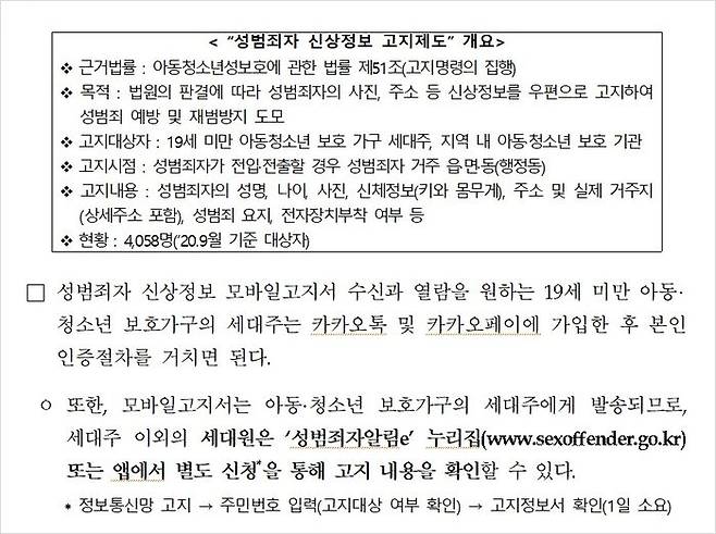 정부는 그간 성범죄자의 신상정보를 19세 미만 아동·청소년 보호가구의 세대주에게 우편으로 내용을 알려왔습니다. 하지만 발송에서 수신까지 3~5일이 소요되고 배송 지연이나 분실, 개인정보 노출 등 문제가 있다는 지적이 꾸준히 나왔습니다.