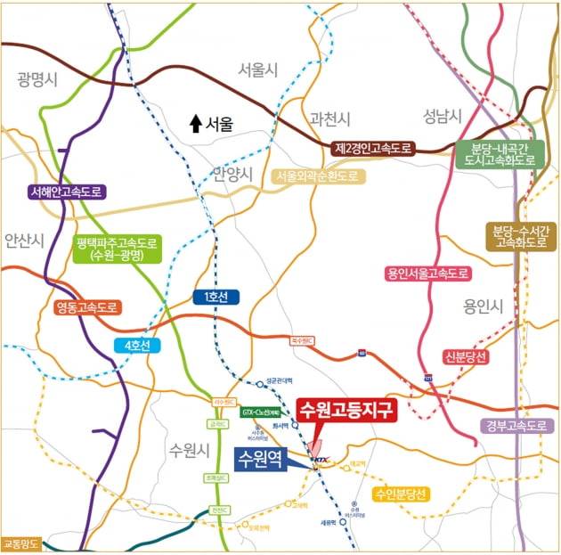 수원고등지구는 경기남부권 교통중심지인 수원역과 가깝다. 지하철 1호선·수인분당선·KTX 등을 이용하기 편하다. 향후 수도권광역급행철도(GTX)-C노선 개발이 예정돼 있다. 수인선 연장으로 수도권 내 접근성이 높아졌다. 수원역환승센터를 이용해 광역버스와 시내버스 노선을 편하게 이용할 수도 있다. 지구 내 대단지로 조성되는 '수원역푸르지오자이' 4086가구와 행복주택 500가구가 내년 1~2월 입주를 시작한다.